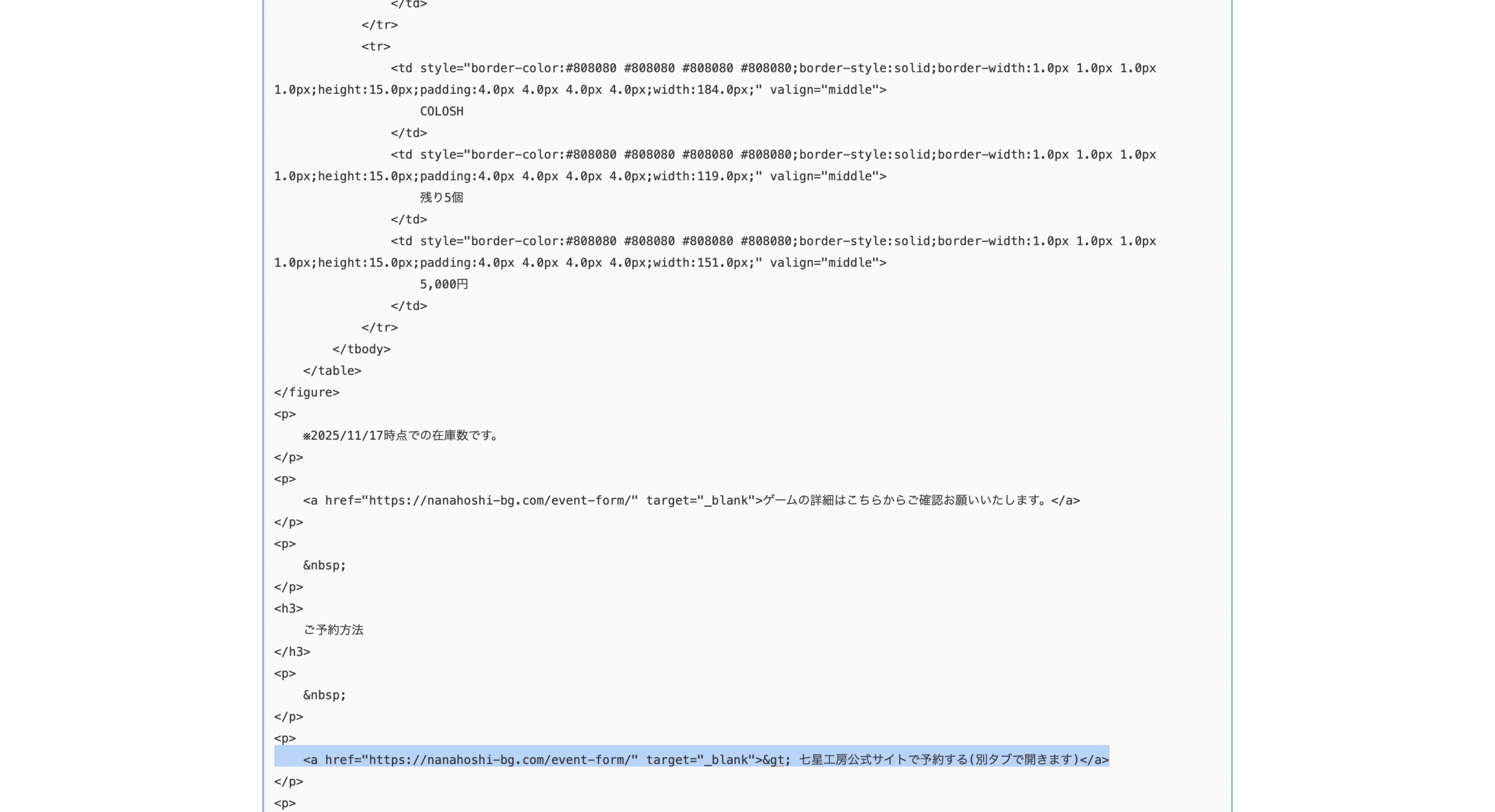 というのが本来の手順ですが、訳わからないコードから「自分が貼りたい位置」を探すのは慣れていないと大変でしょう。テーブルタグ(表)とかリストを使用している人は、より変なコードが並んでいますし、誤ってそのコードのダメな箇所に貼り付けてしまうと、せっかくの記事が壊れてしまう可能性もあります。