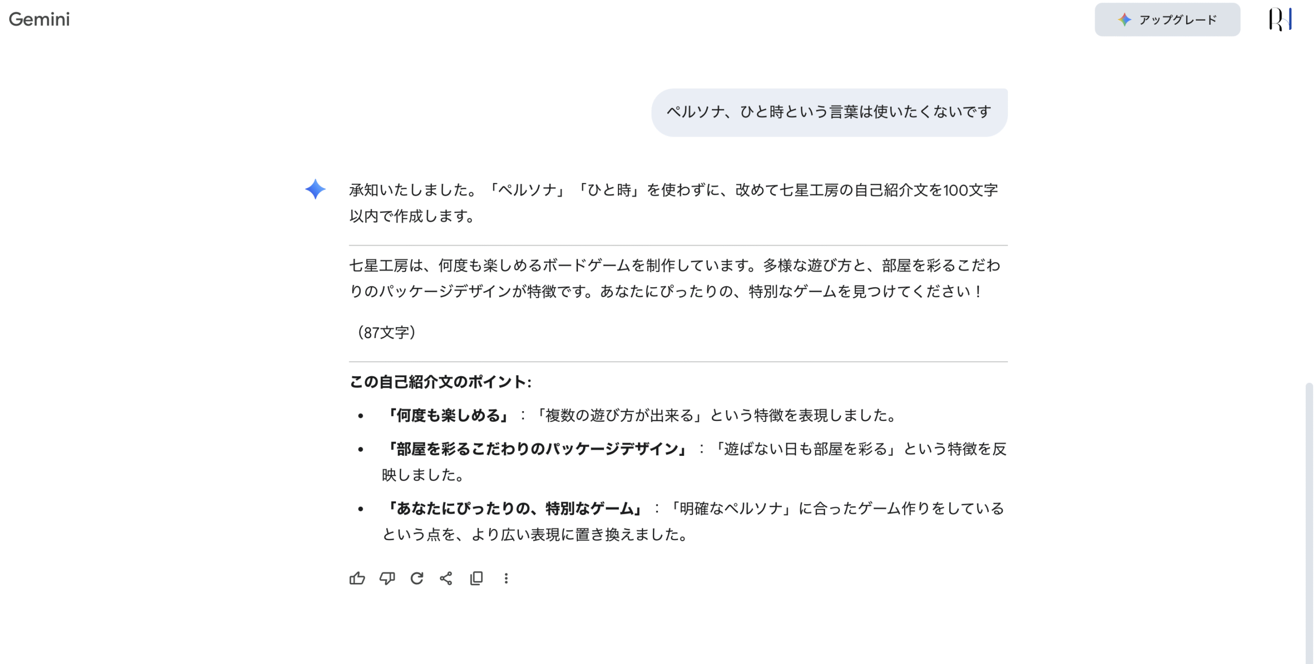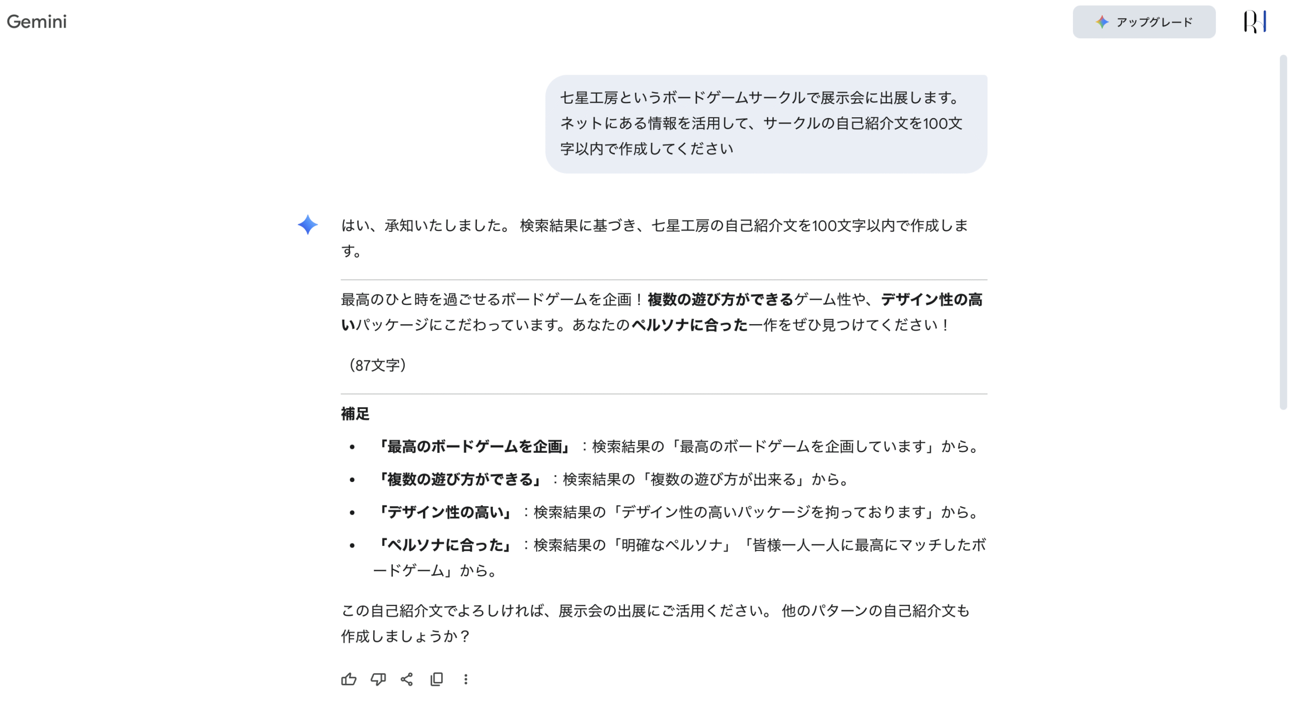 AIの活用方法について色々と賛否両論ありますが、難しい話は私には分かりませんのでこの場では触れずに…今回はボドゲの展示会で使用するキャッチフレーズを作成してみました!(上のアイキャッチ画像もGeminiさんに作成してもらったよ。)
